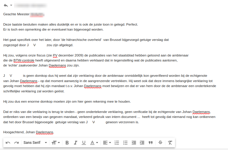 als België 13 jaar aansleept. Nu, van de kwaadwillige bende is nu iedereen op pensioen en de nieuwkomer heeft het hele dossier afgedaan als zever. Klein meningsverschil nog, volgens onze fiscus heb ik HUN werk niet snel genoeg uitgevoerd en heb ik hen pas enkele maanden geleden op de hoogte gebracht dat er sinds 2010 binnen de fiscus een dossier bestaat waar men alle relevante info in kan terug vinden. In die context kan je deze blog eens van bij aanvang doorbladeren... Hadden we daar geen buitenlander die in Charleroi door agenten tot de dood is mishandeld? Hebben we niet ergens een soldaat die met wat zware wapens aan de haal is gegaan? Hebben we daar niet ergens een gezin dat door de fiscus onterecht op straat is gezet? Als we er het nieuws op naslaan lijkt het niet laten doorstromen van informatie een voorwaarde te zijn om bij overheidsdienst aan de slag te gaan.
