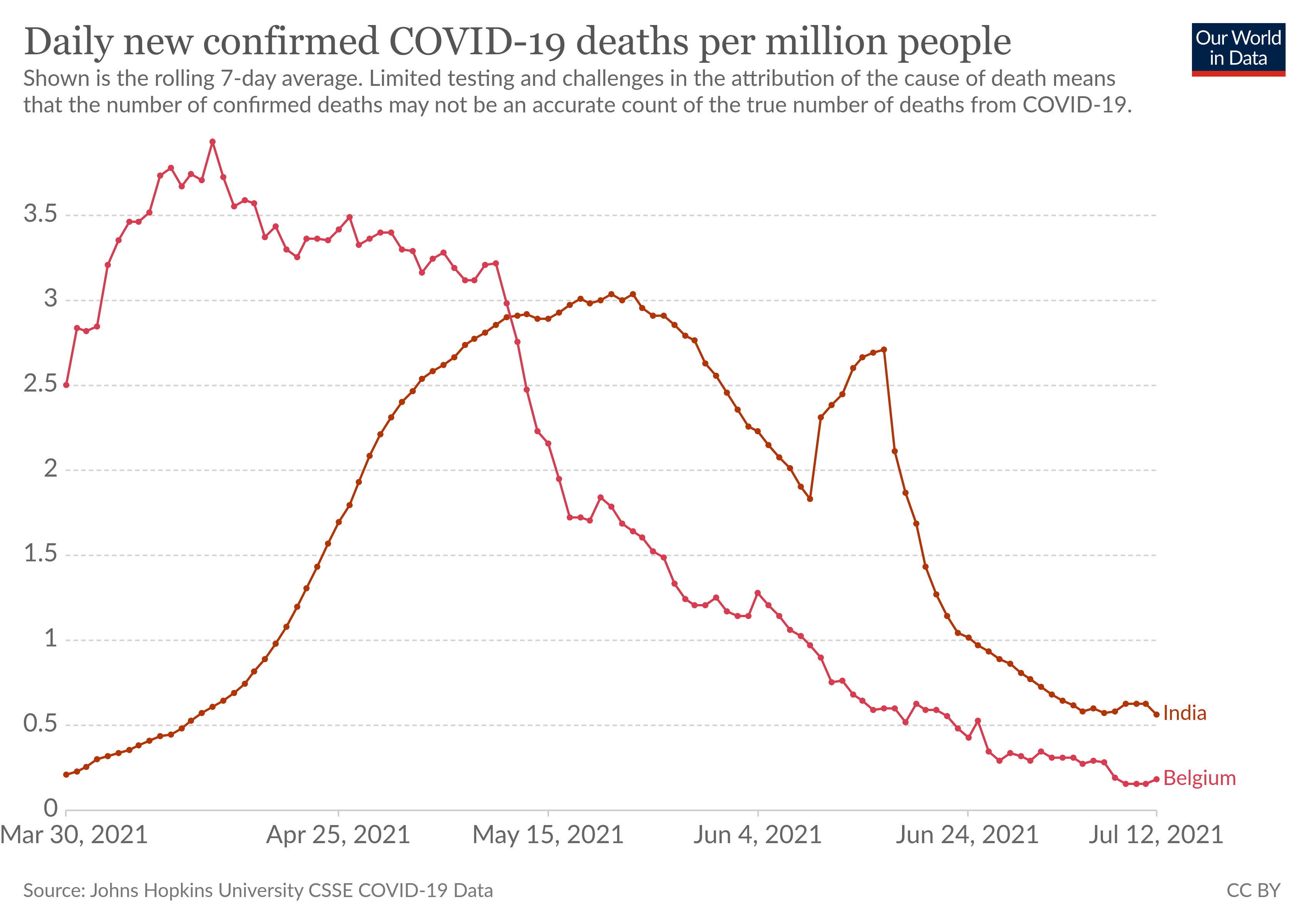 21 infections per 100K people reported last 7 days ter vergelijking: Belgie: 62 infections per 100K people reported last 7 days Nederland: 266 infections per 100K people reported last 7 days UK: 336 infections per 100K people reported last 7 days