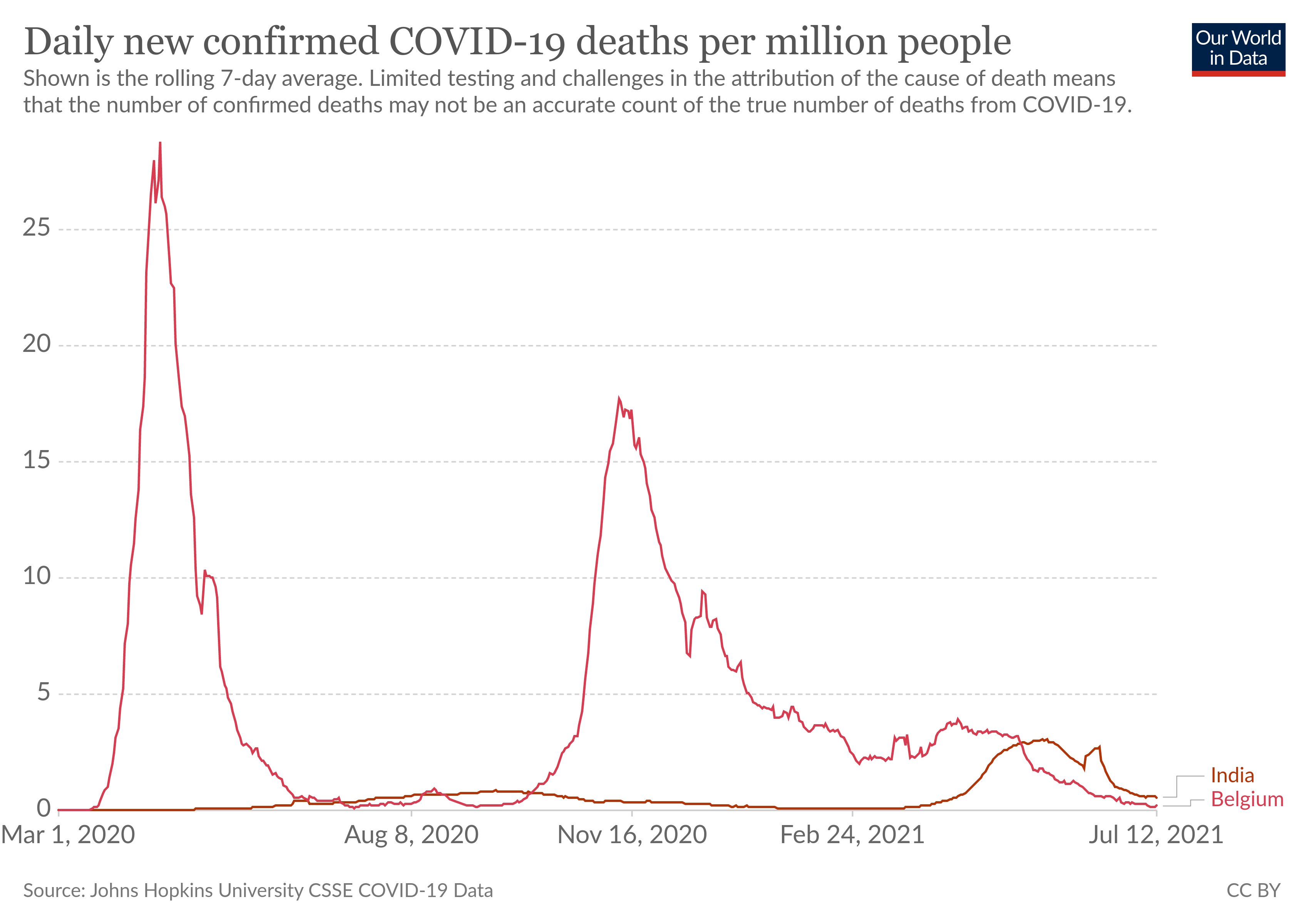 De piek van april-mei is zeker achter de rug in India, maar de vraag is : hoe komt dat nu eigenlijk? De "dor hout" theorie? Covid als een korte bosbrand die de ouden en zwakken wegneemt en dan weer gaat liggen, tot een volgende golf/variant die weer wat resterend dor hout kan aansteken? Laatst gewijzigd door parcifal : 13 juli 2021 om 12:00. |