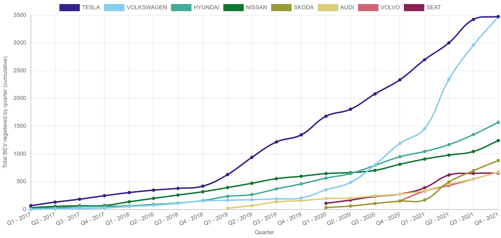 Model Y moet enkel nog de VW ID.4 inhalen, maar dat zal nog in de laatste week van december gebeuren. Nog ~360 stuks in te halen, deze avond kan dat nog 300 worden. Top 10 van 2021 momenteel: Citaat: