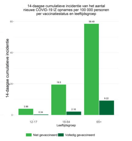 Dat plotje geeft gewoon de efficientie van het vaccin aan, en de circulatie van het virus, meer niet. Zelfs in een 100% gevaccineerde bevolking blijft dat plotje hetzelfde. Als het vaccin uw kans op ziekenhuis opname door 5 deelt, wat natuurlijk enkel maar een eigenschap van dat VACCIN is, dan ga je dus hebben: incidentie in gevaccineerde bevolking is A ==> werkelijke OF THEORETISCHE incidentie in niet-gevaccineerde bevolking (of die er nu is of niet) = 5 * A. DAT is wat dat plotje toont. Laatst gewijzigd door patrickve : 27 december 2021 om 07:51. |