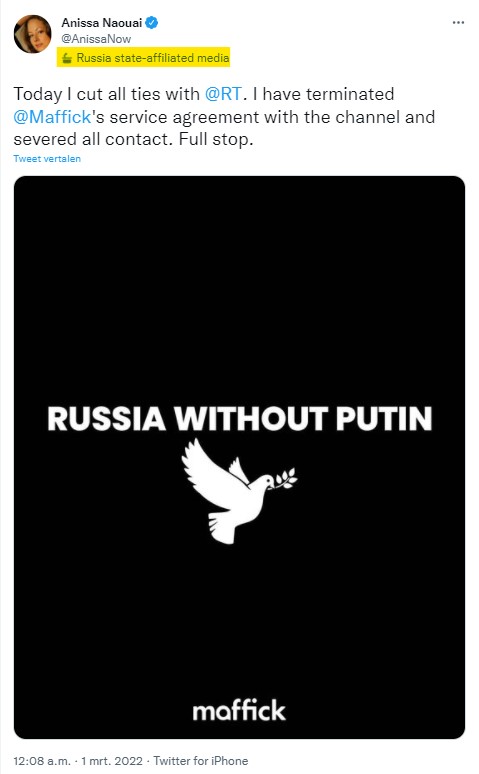 In het Westen is men nu op jacht, RT is gewond en laat al bloedsporen na. Ook op Twitter worden nu ook de Prive accounts van RT en Sputnik "journalisten" gelabeled zodat hun nonsens duidelijk wordt. The Fight is ON. Laatst gewijzigd door parcifal : 1 maart 2022 om 09:39. |