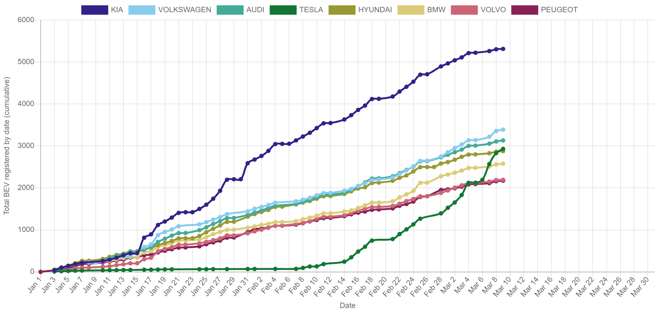 Best sellers for Q1 - 2022 (showing top 8), cumulative registrations by days. Countries: ES, NL, NO, SE (all daily updated) Individual Brands || Auto Groups Laatst gewijzigd door Micele : 9 maart 2022 om 14:24. |