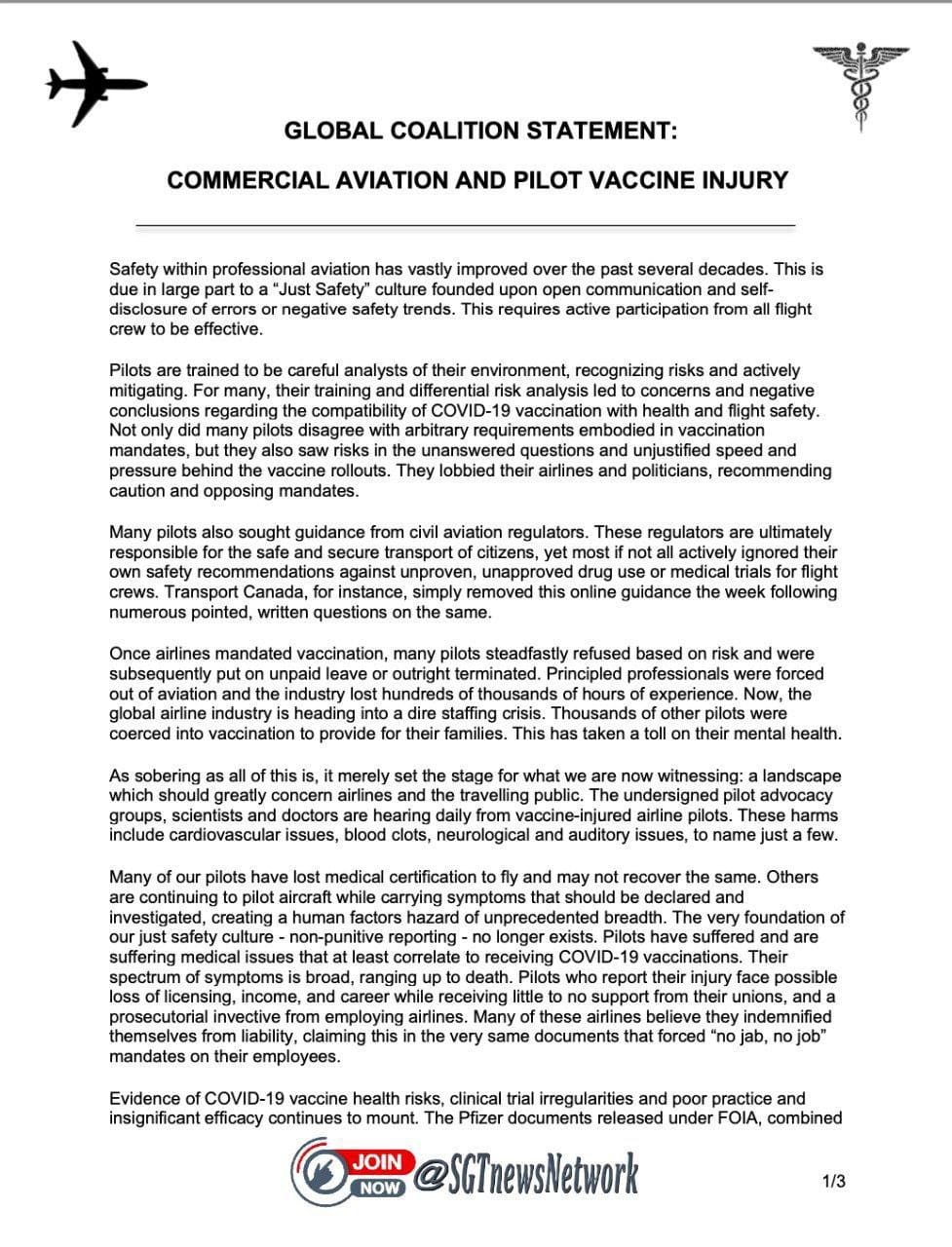 Verklaring van internationale coalitie van luchtvaart- & medische professionals. Ernstige bezorgdheid over aantasting van de veiligheid in de luchtvaart als gevolg van vaccinatiebijwerkingen bij vliegtuigbemanning. Dit vertegenwoordigt meer dan 30 luchtvaartmaatschappijen, 1000-en piloten & meer dan 17.000 artsen en medische wetenschappers.
