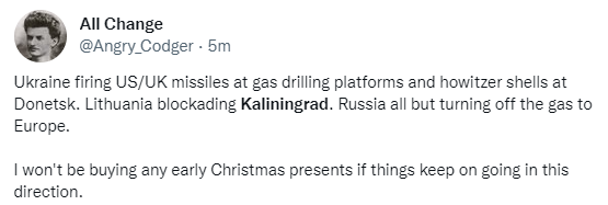 Oekraïne vuurt VS/VK raketten af op olieplatformen in de Zwarte Zee. Howitzer artillerie (VS/VK) op de burgerbevolking van Donetsk. Litouwen blokkeert Kaliningrad. Hebt u al een kerstcadeau'tje gekocht, vraagt onderstaande zich af? (fig.)