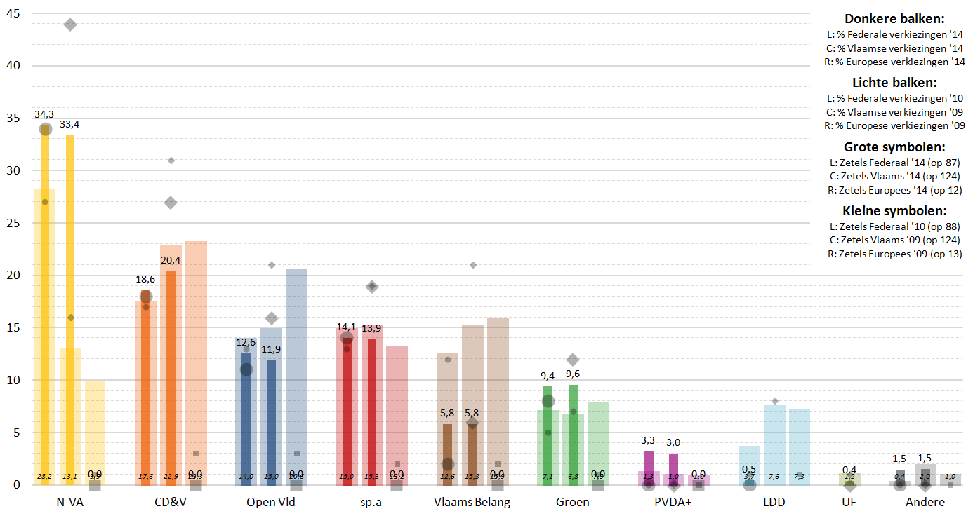 - N-VA: 34 (+7) - CD&V: 18 (+1) - sp.a: 14 (+1) - Open Vld: 11 (-2) - Groen: 8 (+3) - VB: 2 (-10) (LDD verliest zijn zetel.) Voorlopige zetelverdeling Vlaams Parlement (goeie 643.000 stemmen): - N-VA: 44 (+28) - CD&V: 27 (-4) - sp.a: 19 (=) - Open Vld: 16 (-5) - Groen: 12 (+5) - VB: 6 (-15) (LDD (8) en UF (1) verliezen hun zetels.)