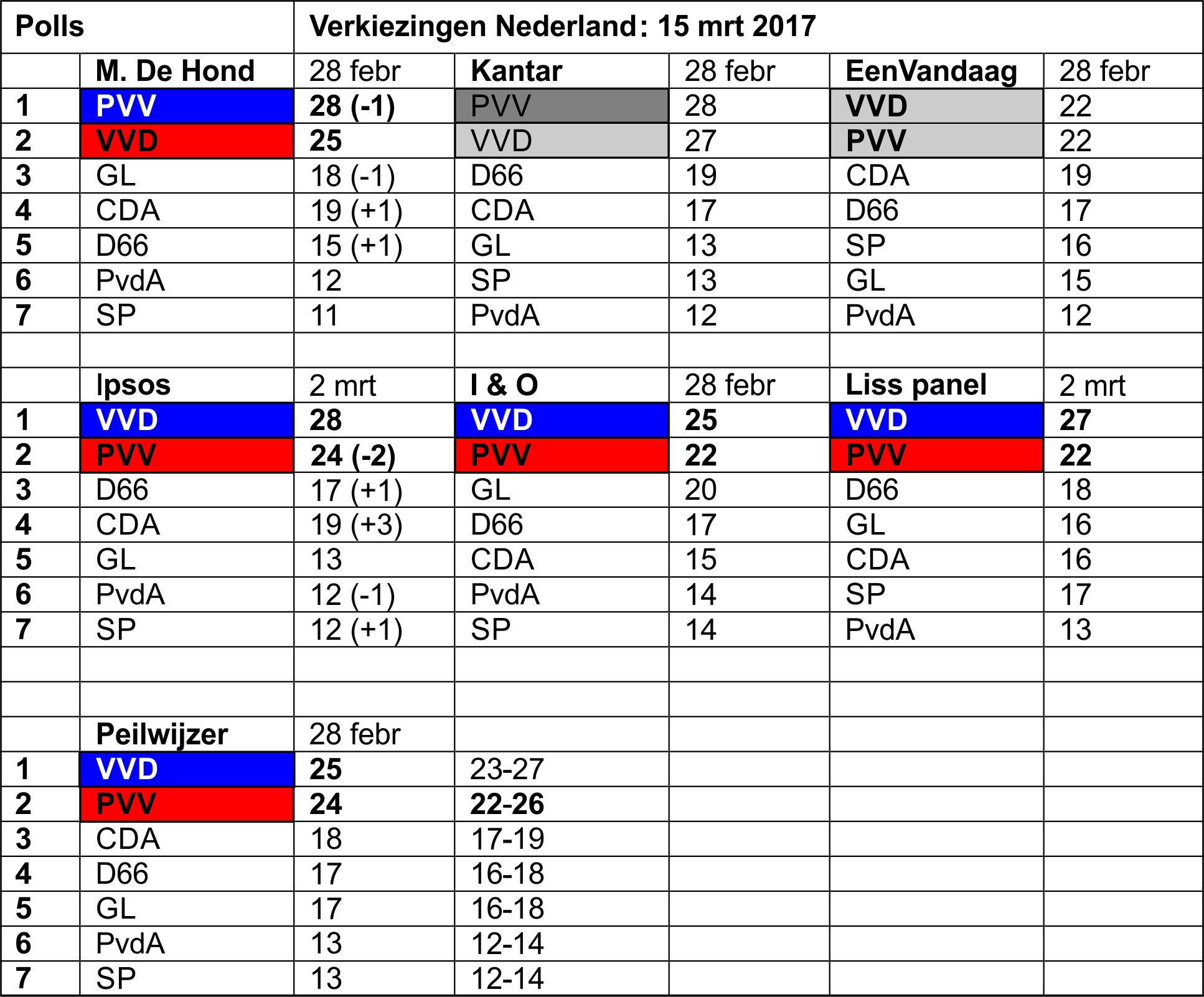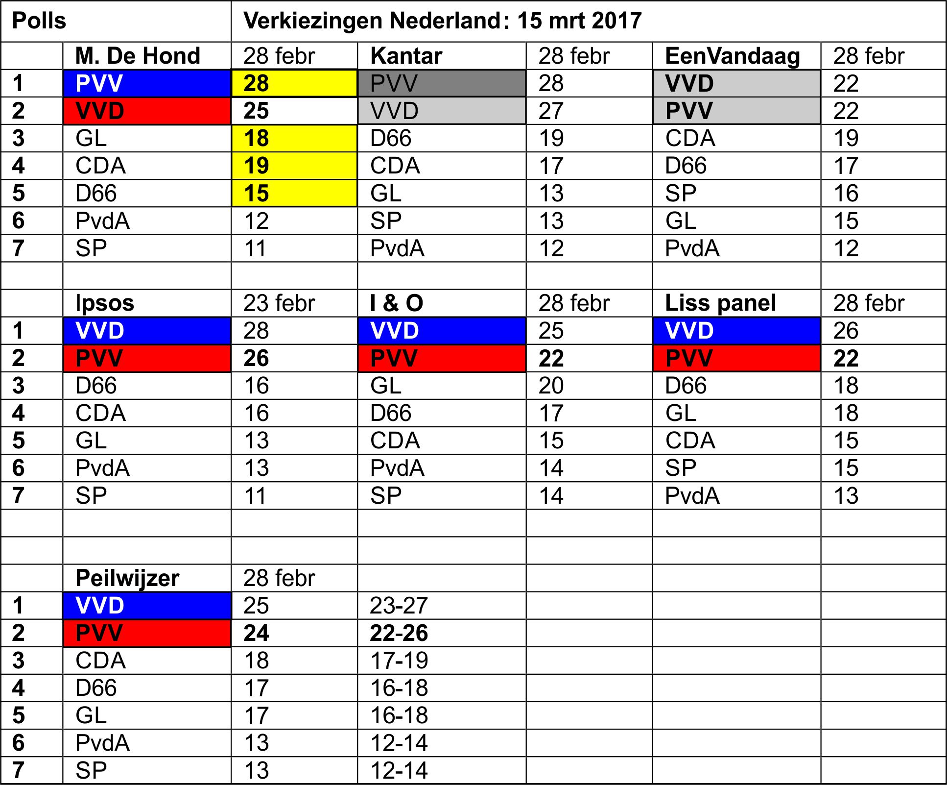 Geen enkel medium benadrukt dat een slachting heeft plaats gevonden Evenmin dat de PVV alleen bij de Hond nog op winst staat. Tevens geven ze het aantal zetels, inclusief restzetels, aan. PVV en VVD momenteel (Liss panel) Aangezien ook andere peilers 22 zetels aangeven komt dit ook bij hen neer op ongeveer 20.683 zetels voor de PVV, exclusief restzetels Het verschil wordt dermate klein met een enkele partij eronder dat de PVV de grens nadert gepasseerd te kunnen worden VVD: 25.693 zetels. Inclusief restzetels: 27 Verschil: -5.010 zetels (440.860 kiezers) |