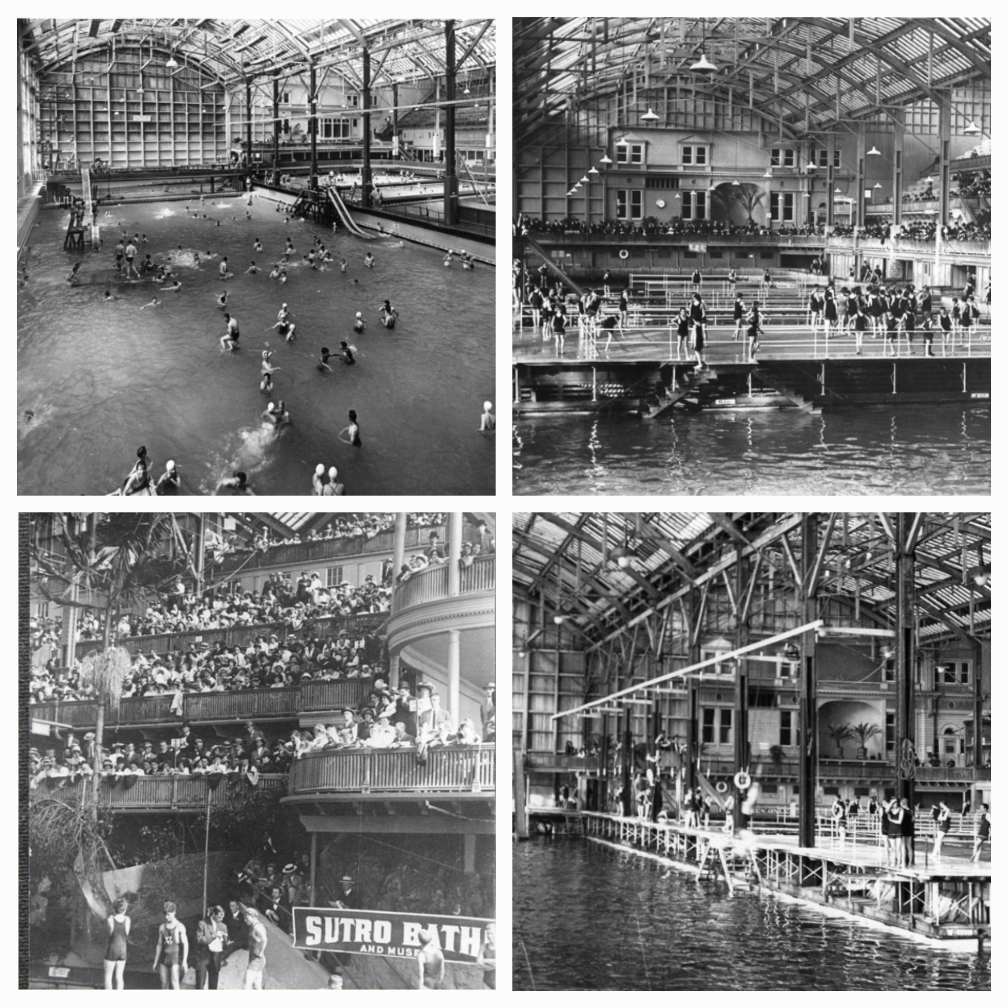 "The Sutro Baths had a total area of 161,000 sq feet (15,000 sq meters) and featured a variety of swimming pools and other amenities. The main pool was 300 feet (91 meters) long, 100 feet (30 meters) wide, and 20 feet (6 meters) deep, with a capacity of 1.5 million gallons..."