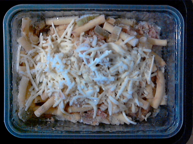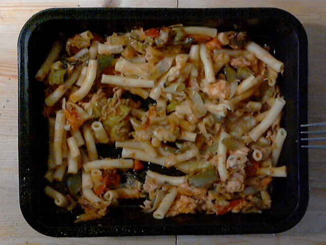 De pasta herken ik. Maar wat is de rest? Kip met groene pepers?