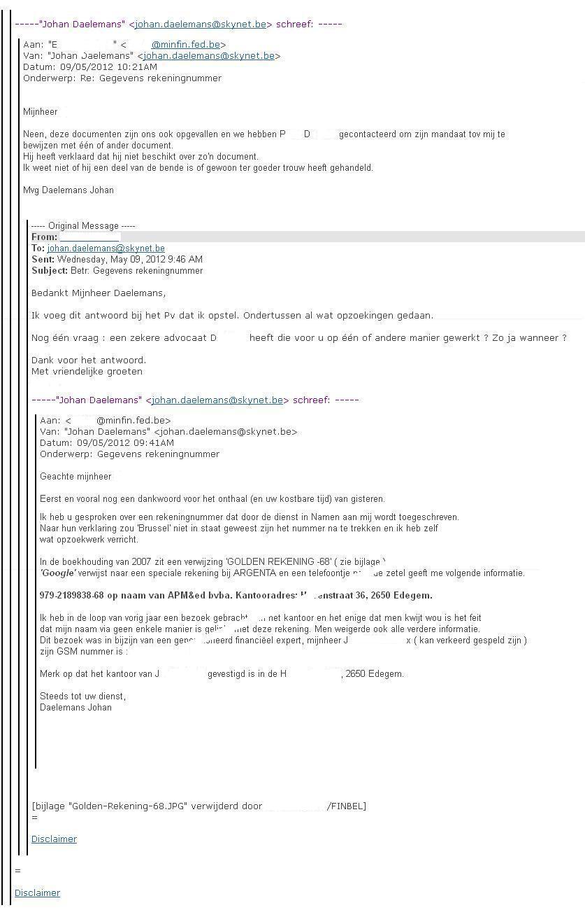 Wil je nu echt de mensen overtuigen dat iemand met een gewoon full-time jobke (carrosserie Petit-Jean te Vilvoorde) ondertussen tijd en geld heeft om 40 bedrijven te runnen en aan de haal te gaan met 6.000.000€? Dat die man zo slim is dat Gerechterlijke van Mechelen (met zicht op alle rekeningen , Golden Rekening inbegrepen) zich volledig belachelijk maakt door 6 verkeerde mensen aan te houden? Geef dan eens een zinnige reden waarom ik hier alles uit de doeken kom doen op een forum in plaats van op een zeiljacht te liggen in de Bahama's? Om wat interresant te doen misschien? Nu, met de reeds geposte info stopt het nog van bijlange niet hoor. Neem een zakje chips en geniet, er komt nog. |
