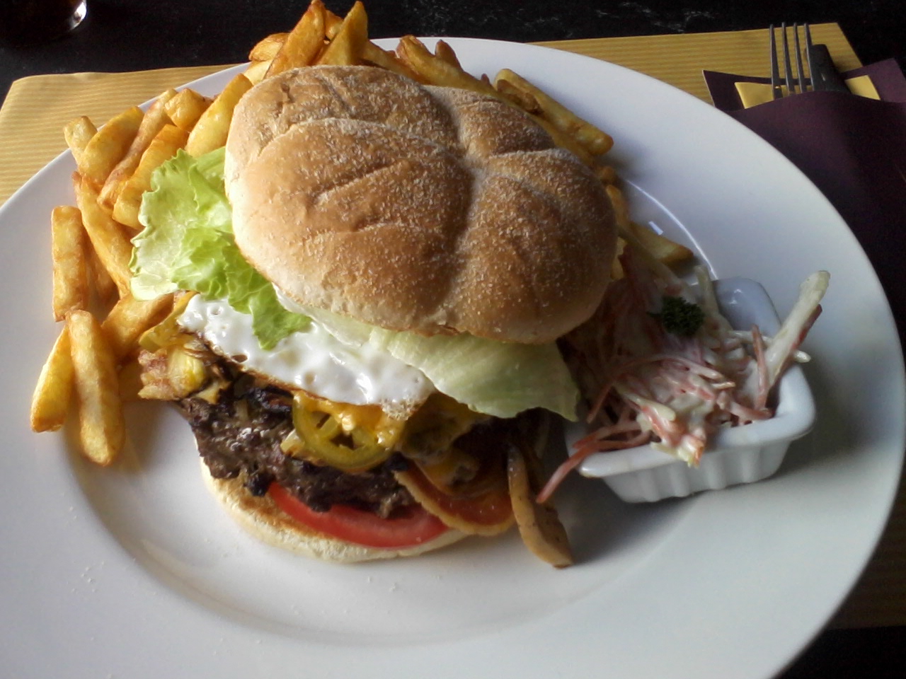Een burger ? ! Weet je dat ze daar varkenvlees indraaien ?! Ze zeggen dat het 100 % beef is, maar geloof het niet hé. Zij liegen.