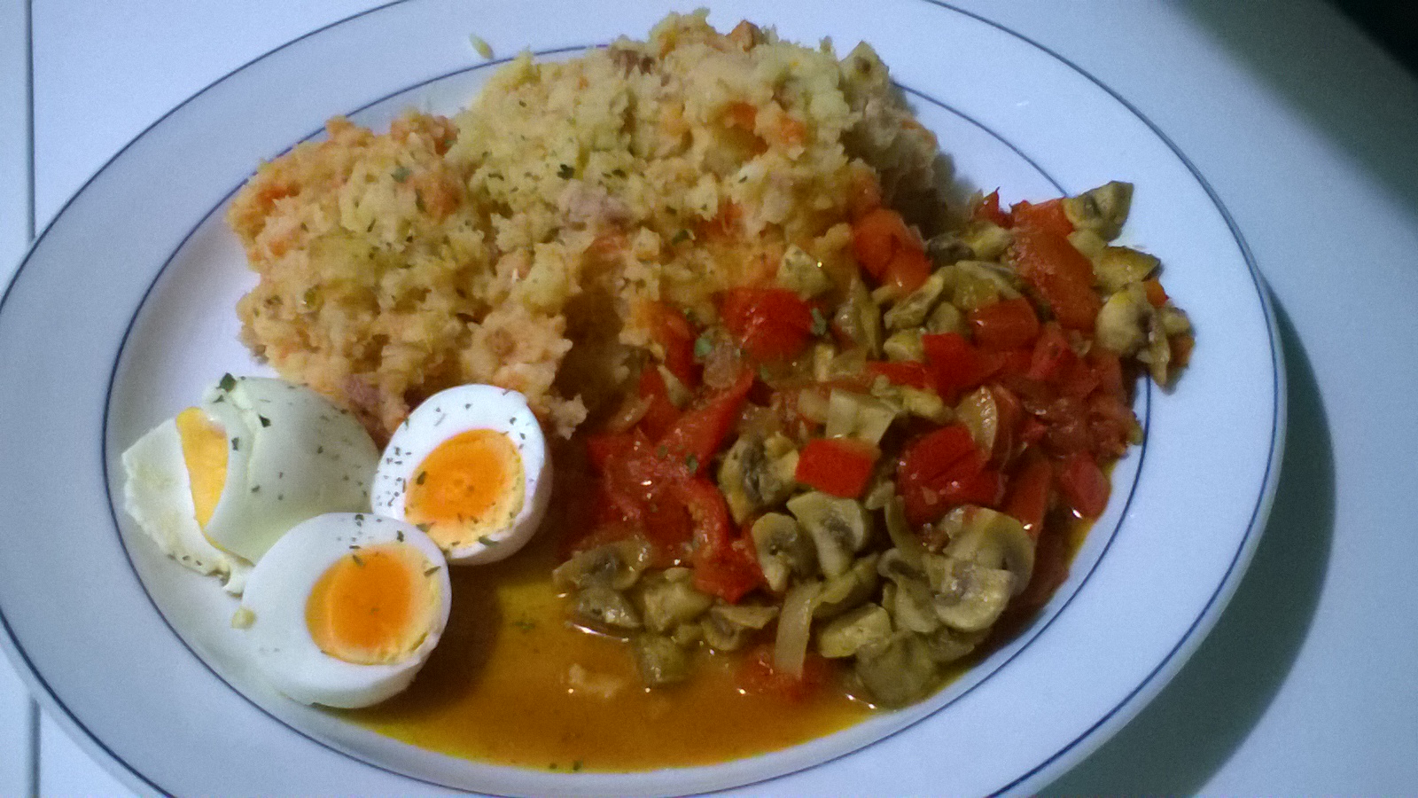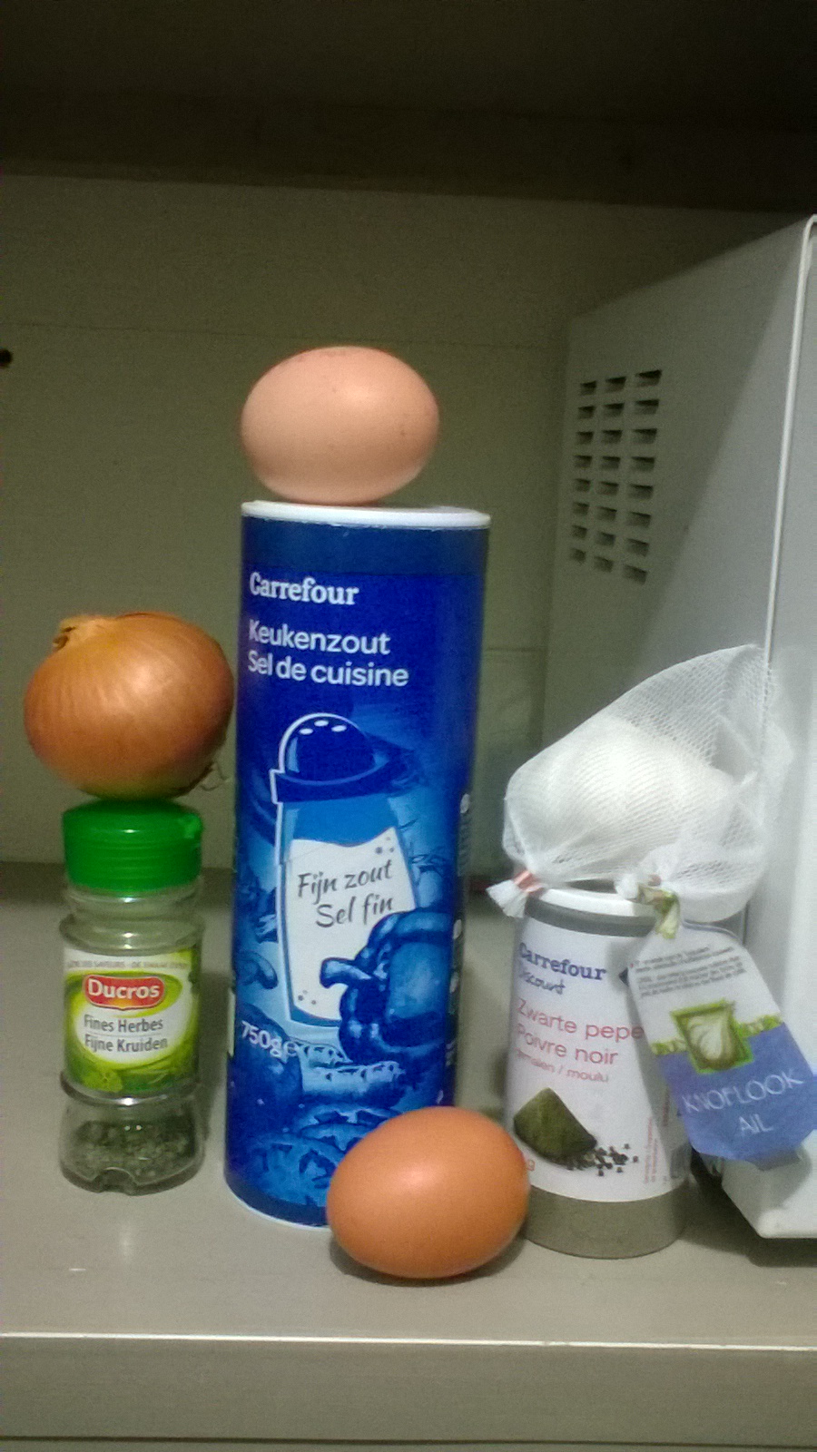 ![]() Gisteren op restaurant, met een vissoep, een rogvleugeltje met puree en een crème brûlée, vandaag iets meer low key, mijn koelkast eens uitgekuist, en een omelet met koolrabi (eventjes geblancheerd vooraf), prei, ajuin, en wat teriyakisaus klaargemaakt, geserveerd met rijst.