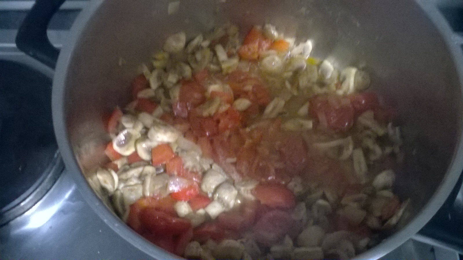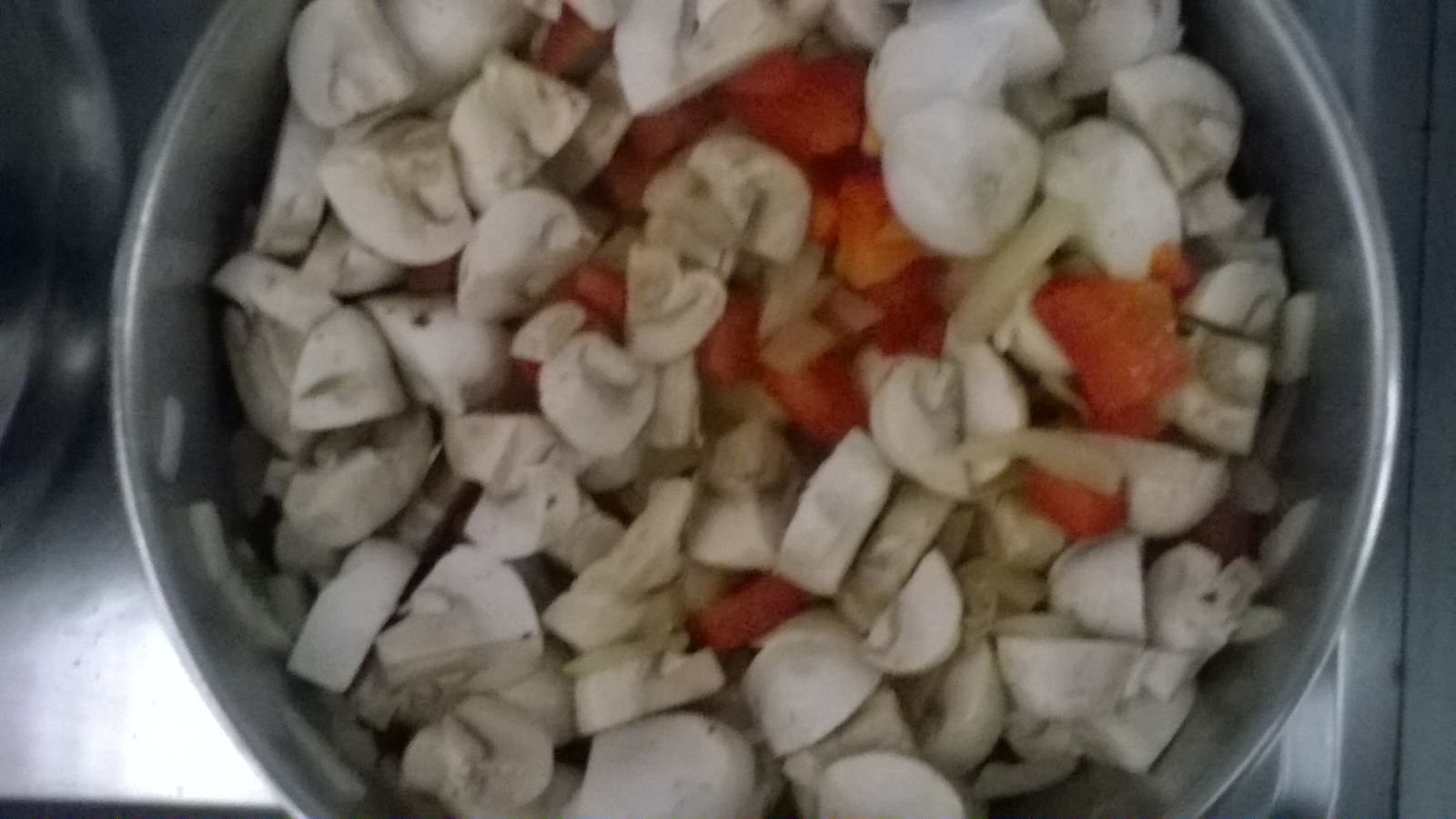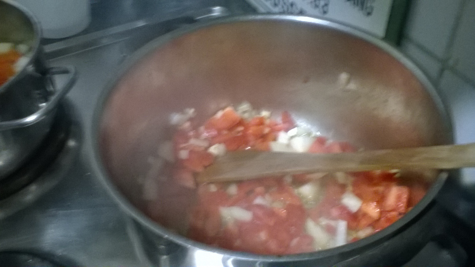 ![]() Gisteren een snelle paella valenciana gemaakt. In een ovenschaal twee kopjes rijst, saffraan + kurkuma voor de mooie kleur te bekomen, een fijn gesnipperde ui + paprika, 150 gram op reepjes gesneden chorizo, kipfilets bakken, op blokjes snijden en toevoegen, kippebouillon toevoegen, een groot glas noilly prat bijgieten, flink wat peper van de molen, wat verse oregano die we zelf groeien hier, 40 minuten in de oven op 180 graden. Daarna totaal vergeten er nog wat tomaten passata bij te voegen