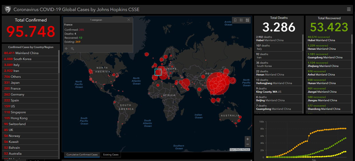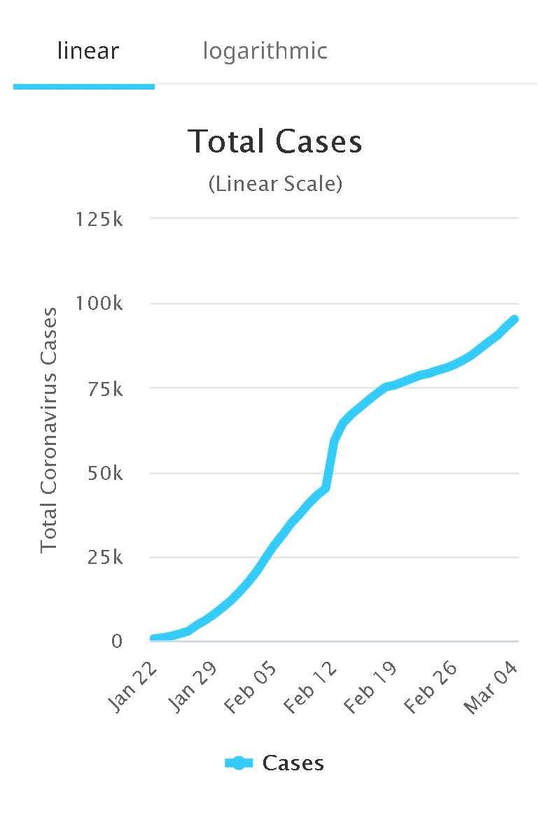 ![]() En dit is de grafiek van Worldometer waar we nu staan, op wereldvlak: Laatst gewijzigd door discuz : 5 maart 2020 om 16:39. |