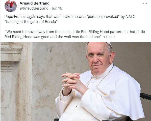 Paus Franciscus: "Rusland werd (misschien) geprovoceerd, de NAVO stond te blaffen aan de poorten van Rusland." https://twitter.com/RnaudBertrand/st...71579811909632 (fig.)