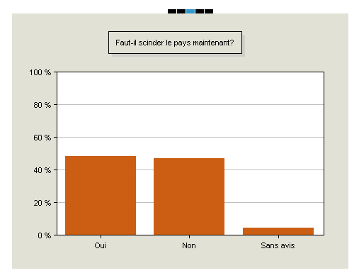 Uitweg politieke impasse: 53.103 stemmers Antwoord Stemmers Percentage Splits het land nu maar 23.085 44% Interesseert me niet meer 14.879 28 % Nieuwe verkiezingen 8.719 16 % Noodregering 4.910 9 % Nieuwe bemiddelaar 1.420 3 % http://www.hln.be/hln/nl/1274/De-for...iezingen.dhtml |