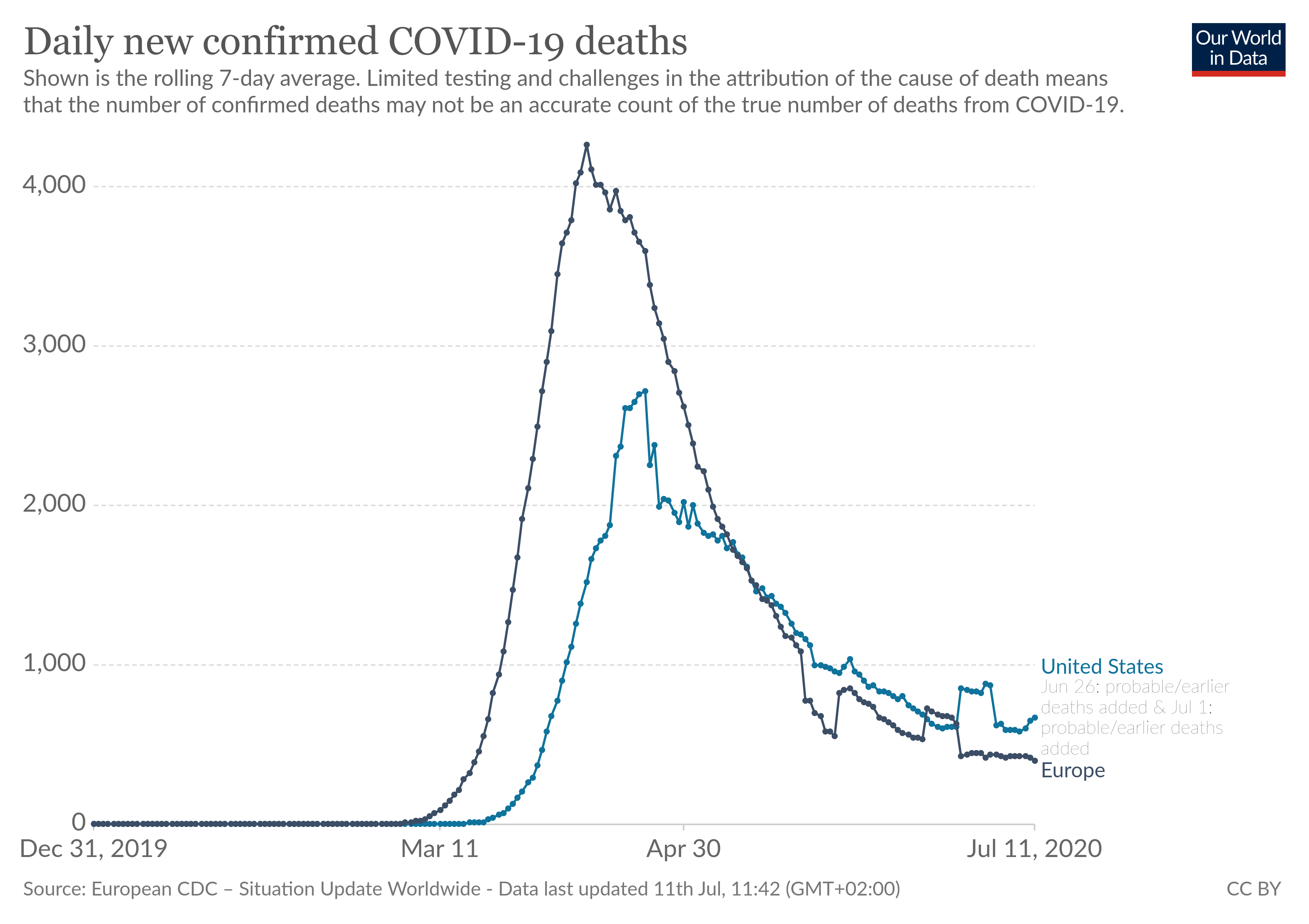 Europa 2 keer zoveel doden per dag als de USA. Nochtans ongeveer evenveel "positieve gevallen". |