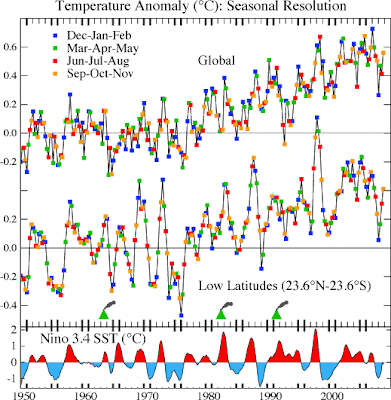 zet je dat in grafiek uit krijg je : => een stijging (blauwe lijn) tgv CO2, maar op die stijging zit tgv de enso-cyclus ook een schommeling. => de temperatuur zal niet lineair (blauwe lijn) maar schommelend (groene lijn) omhoog gaan. wat de exxon-lobby doet is, zoals ik in dat ander grafiekje meegaf, lijntjes trekken vanop de top van de golf (een Nino-jaar) naar de bodem van de golf (een Nina-jaar) heeft geen donder met klimaatwetenschap te maken. als je dan ook iemand iets over een tienjarige periode ziet schrijven, weet je met deze info al dat hij je probeert te bedriegen met je ogen open ... Dat klimaat over dertig jaar (en niet korter) wordt gedefinieerd is immers net OMDAT dergelijke schommelingen overwonnen moeten worden Laatst gewijzigd door Jedd : 23 mei 2009 om 16:28. |