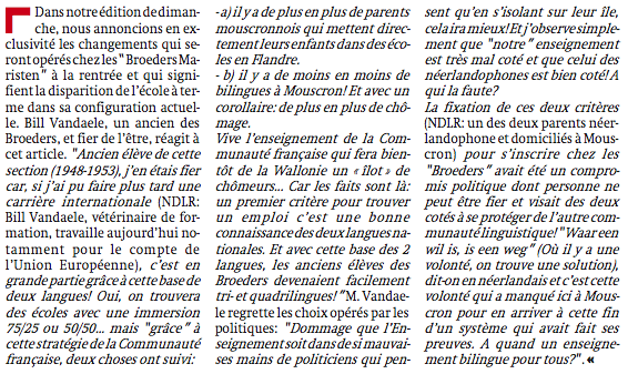 In Wallonië heb je welgeteld 2 Nederlandstalige schooltjes. Eentje in de Waalse - maar voor 1963 Vlaamse - gemeente Komen ( Comines) die 'De Taalkoffer' heet (+/- 35 leerlingen) . En een ander schooltje in de Waalse - maar ook hier voor 1963 Vlaamse - gemeente Moeskroen (Mouscron) : het 'Broeders Maristen Instituut' met ongeveer 75 leerlingen. Het schooltje in Komen weigert de Franse Gemeenschap sinds de jaren 80 te erkennen en te subsidiëren omdat de aanvraag voor die school 'onreglementair' zou geweest zijn. Het federale niveau is dan tijdelijk bijgesprongen en ondertussen neemt de Vlaamse gemeenschap die financiering op zich. In het statuut van de enigste door de Franse gemeenschap erkende Nederlandstalige school in Wallonië kwam onlangs verandering. De directie van die school heeft uit schrik voor het afkalven van haar leerlingenbestand nu gekozen om haar statuut van Nederlandstalige school te verlaten. Ze is sinds dit schooljaar opgegaan in het onderwijsproject van het Franstalige Institut Frères Maristes dat immersieonderwijs aanbiedt. De Nederlandstalige leerlingen in Moeskroen moeten nu kiezen voor 100% lessen in het Frans, 50% Frans/50% Nederlands of voor 75% Nederlands/25% Frans. Daarmee is er dus geen enkele Nederlandstalige school meer in Wallonië erkend door de Franse Gemeenschap. Verder kan je je de vraag stellen waarom het faciliteitenonderwijs niet sowieso overal vervangen wordt door tweetalig immersie-onderwijs. Want dat er eentalig Frans onderwijs gegeven wordt in Vlaamse faciliteitengemeenten of eentalig Frans onderwijs in Duitstalige gemeenten lijkt me niet zo bevordelijk voor de integratie van die Franstalige leerlingen in de regio waar ze wonen en schoollopen. ====== MOUSCRON : L’ÉCOLE FLAMANDE SE TRANSFORME publié le 27/08/2009 On ne doit pas parler de fermeture ou de disparition, mais de transformation ” Ainsi parle Hilde De Clercq, la directrice de l’école néerlandophone “ Broeders Maristen Instituut ” de Mouscron. Cette école, atypique en Wallonie, était en danger. http://mouscron.nordeclair.be/region...e-723304.shtml |