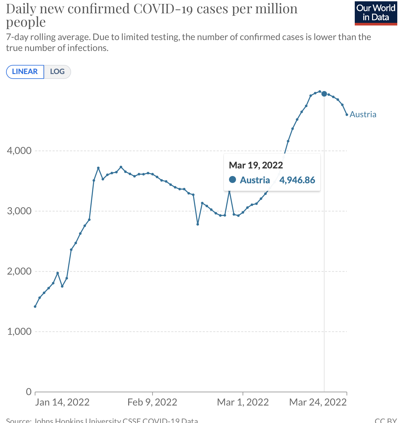 In Oostenrijk gaan ze overigens vanaf vandaag terug een mondmasker moeten gaan opzetten. Dat de cijfers al aan het dalen zijn komt natuurlijk door het effect van de maatregel aan te kondigen.