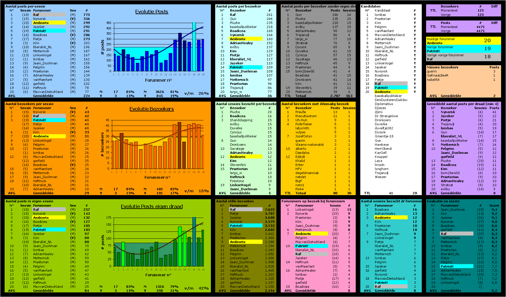 Nieuwe bezoekers (3) Van harte welkom aan: guerin GaRnaaLBeeR nabat54 Bezoekers sinds laatste sessie Momenteel 123 Vorige 120 Verschil 3 nieuwe bezoekers Posts sinds laatste sessie Momenteel 4471 Vorige 4149 Verschil 322 nieuwe berichten Huidige forummers Huidige forummer 20 Ambiorix Vorige forummer 19 Patriot! Vorige vorige forummer 18 Raf Aantal posts per sessie - Raf blijft eenzaam aan de top - Ambiorix haalt het podium - Alleen laatste 7 forummers hebben meer posts dan gemiddelde Aantal bezoekers per sessie - Ambiorix haalt 7-de plaats, gebrek aan eenlink in de handtekening zal hier voor iets tussen zitten, Nynorsk blijft de top aanvoeren Aantal posts in eigen sessie - Ambiorix wordt top 3, Raf blijft eenzaam aan de top - Buiten de laatste 7 forummers halen enkel Kim en liberaliost_NL meer dan het gemiddelde Aantal posts per bezoeker - Raf blijft eenzaam aan de top, maar waarschijnlijk gaat baseballpolitieker daar deze week verandering in brengen Aantal sessies bezocht per bezoeker - Spijtig genoeg weinig oud-forummers te bespeuren, blijkbaar zijn de forummers minder geïnteresseerd in de andere Aantal stille bezoeken - Ambiorix haalt pas 9-de plaats, waarschijnlijk te wijten aan de verkorte sessie Aantal posts per bezoeker zonder eigen sessie - Baseballpolitieker kan hier deze week niet scoren Aantal bezoekers met éénmalig bezoek - 30 bezoekers hebben slechts in één draad berichten achter gelaten, evenveel als vorige week maar met de 3 nieuwe bezoekers wil dat zeggen dat we er ook 3 terug gezien hebben uit de lijst van vorige week Forummers op bezoek bij forummers - Linkse vogel kreeg maar liefst 15 forummers op bezoek, waarschijnlijk door nieuwsgierigheid omwille van zijn leeftijd en een aantal baude voorafgaandelijke stellingen - De laatste weken loopt het alweer wat beter, Ambiorix wordt 7de Aantal forummers op bezoek - Een groot aantal bezoekers zien we amper terug na hun eigen sessie, Boadicea haalt hier ruim de 1ste plaats en Ambiorix koloniseert de 3de plaats Gemiddeld aantal posts per sessie (min 4) - Nynorsk staan ruim op 1 maar heeft maar 4 sessies bezocht en is reeds forummer geweest Evaluatie na sessie - Patriot! haalt een magere 7.7 en slechts 21 bezoekers hebben een stem uitgebracht LEGENDE Verklaring van het dashboard - Telkens top 20 wordt getoond - Sessie staat voor het n° van de sessie - De laatste 3 forummers worden gehighlight o Laatste in het geel o Voorlaatste in het blauw o Voorvoorlaatste in het grijs - Wanneer er gemiddelden worden getoond wordt de score van de forummers die zich boven het gemiddelde bevinden vet gedrukt - Bij de kandidaten vindt men de forummers die reeds aan de beurt geweest zijn en de kandidaat vervangers indien er zich geen nieuwe kandidaat zou voordoen - Onder de grafiekjes vindt men de relatie m/v wat betreft het aantal forummers en hun score voor de betreffende grafiek, aangevuld met de mate waarin dames het beter(+)/slechter(-) doen dan de heren - In de grafieken duidt de oppervlaktegrafiek het gemiddlede aan over alle sessies - In de grafieken worden de scores van de dames in een lichtjes ander kleur getoond dan de heren - De lijn-grafiek is een trendline gemeten volgens een polynomial met 3 vrijheidsgraden Verklaring van de tabellen - Aantal posts per sessie: Het aantal posts geplaatst in de bewuste sessie na het geven van de evaluatie - Aantal bezoekers per sessie: Het aantal effectieve bezoekers die een bericht hebben achtergelaten in de bewuste sessie na het geven van de evaluatie - Aantal posts in eigen sessie: Het aantal posts geplaatst in de bewuste sessie na het geven van de evaluatie door de forummer van de week zelf - Aantal posts per bezoeker: Het totaal posts geplaatst in alle sessies na het geven van de evaluatie - Aantal sessies bezocht per bezoeker: Het aantal sessies bezocht na het geven van de evaluatie - Aantal stille bezoeken: Het aantal stille bezoeken, wat niet noodzakelijk het achterlaten van een posts noodzaakt, in de bewuste sessie na het geven van de evaluatie - Aantal posts per bezoeker zonder eigen sessie: Het totaal posts geplaatst in alle sessies na het geven van de evaluatie uitgezonderd de posts van de forummers in hun eigen sessie - Aantal bezoekers met éénmalig bezoek: Het aantal effectieve bezoekers die een bericht hebben achtergelaten in slechts één sessie na het geven van de evaluatie - Forummers op bezoek bij forummers: Het aantal forummers dat een bezoek bracht in de sessie per forummer - Aantal forummers op bezoek: Het effectieve aantal sessies waar de bewuste forummer een bericht heeft achter gelaten - Gemiddeld aantal posts per sessie (min 4): Het gemiddeld aantal posts per sessie pas gerekend vanaf 4 effectief bezochte sessies - Evaluatie na sessie: Score ten gevolge van de punten uitgedeeld door de bezoekers -