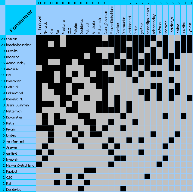 Forummers op bezoek bij forummers - Linkse vogel kreeg maar liefst 14 forummers op bezoek - Heel veel forummers met 10 bezoeken (Raf Praetorian C2C Pelgrim Desiderius Patriot! Ambiorix Metternich Jaani_Dushman) - Cynicus wordt laatste met 3 bezoekers - Cynicus wordt eerste met 20 bezoeken - Een omgekeerd evenrechtige trend, hoe meer men post in andere topics hoe minder men op bezoek komt