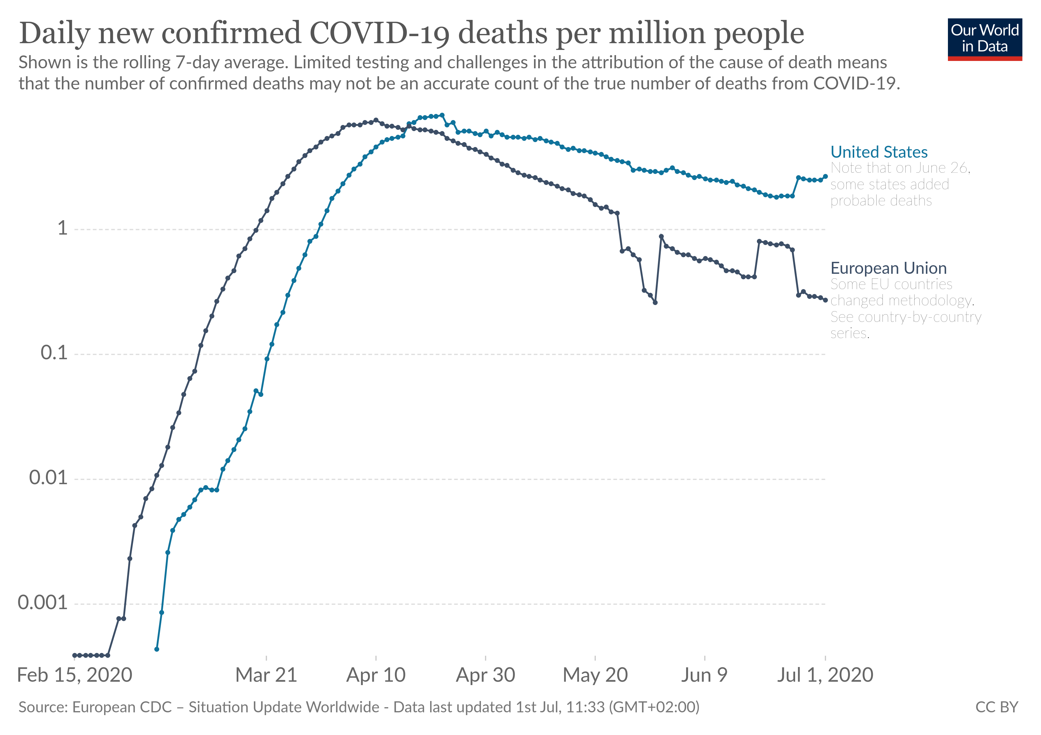 In de US is er dankzij Trump een complete chaos. Hij moedigt zijn aanhangers zelfs aan om hun voeten eraan te vegen (terwijl hijzelf draconische maatregelen neemt om zelf niet besmet te geraken). Het resultaat staat in de grafiek. Ze hebben terug een exponentiele stijging.