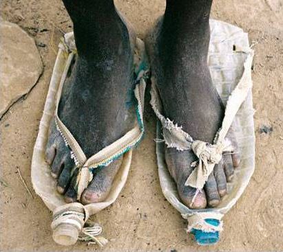 Zeg Jaani, zo'n sandalen zoals de Viet Cong maakte uit een stuk autoband, is dat niets voor jou? Heel goedkoop en ze gaan ook lang mee. |