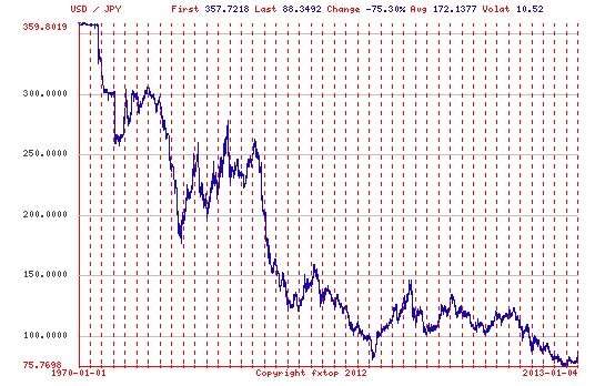 (fig.: evolutie van de wisselkoers USD/JPY van 1 jan 1970 tot 5 jan 2013)