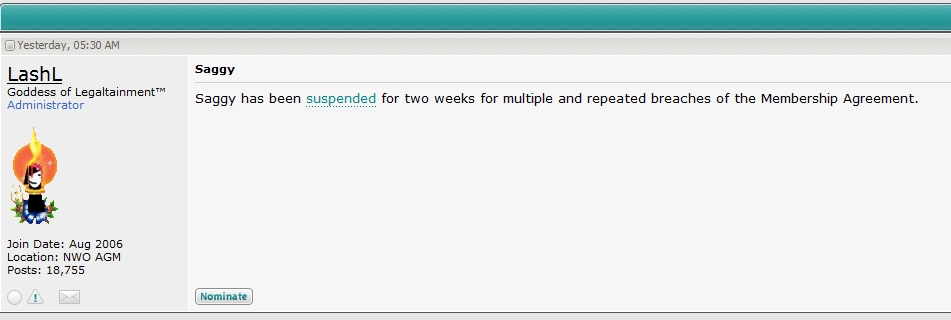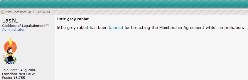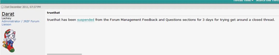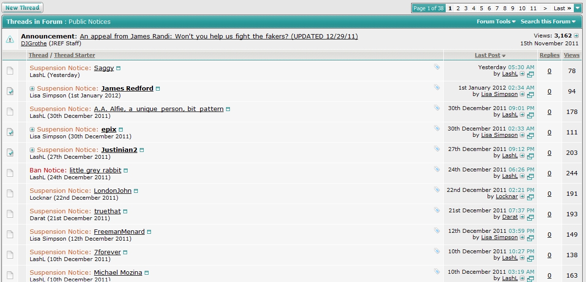 Op het JREF-forum hebben ze een apart subforum waar enkel mods kunnen posten, en waar voor elke verbanning een mededeling wordt gepost. Voor tijdelijke verbanningen staat de lengte ervan vermeld, en de reden van de verbanning wordt summier gegeven.