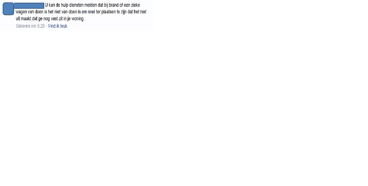 Voor 't geval de foto niet duidelijk is, de tekst luidt : "U kan de hulp diensten melden dat bij brand of een zieke wagen van doen is het niet van doen is om snel ter plaatsen te zijn dat het niet uit maakt dat ge nog vast zit in je woning." Zo staat het er letterlijk. Ik snap er niks van maar misschien ben ik niet slim genoeg