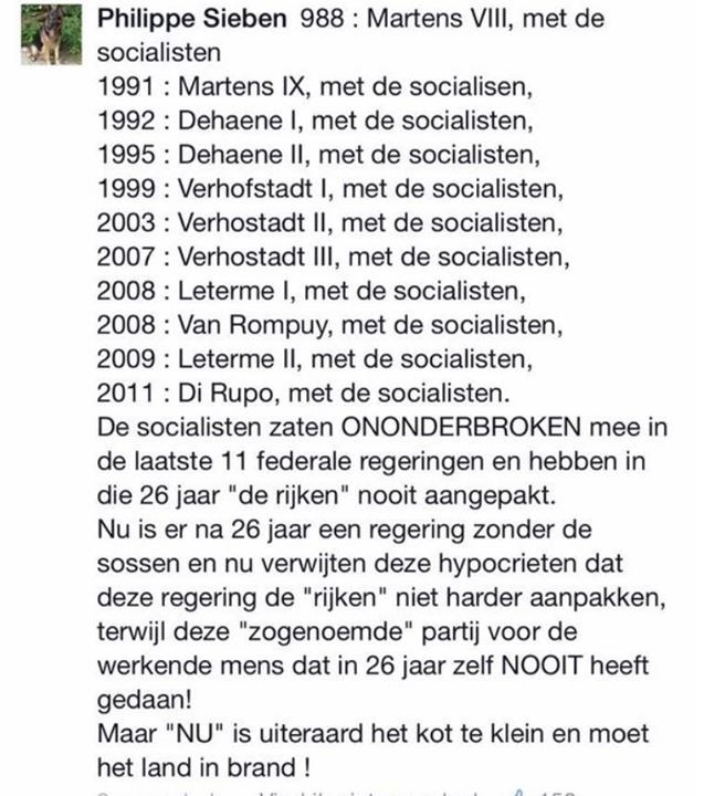 ![]() het is niet de schuld van "de socialisten" als in "de spa". Het hele Belgische systeem is socialistisch. De ideologische verschillen tussen de traditionele partijen zijn miniem. Ze zitten allemaal samengepakt op dezelfde vierkante centimeter van verstikkende conventionaliteit. Als je het niet gelooft, leg de partijprogramma's van groen, spa, cd&v en open vld eens naast elkaar, en zoek de 10 verschillen. Zelf het VB is socialistisch want ook zij willen een sterke overheid die zich voortdurend met het leven van de burger wil bemoeien.