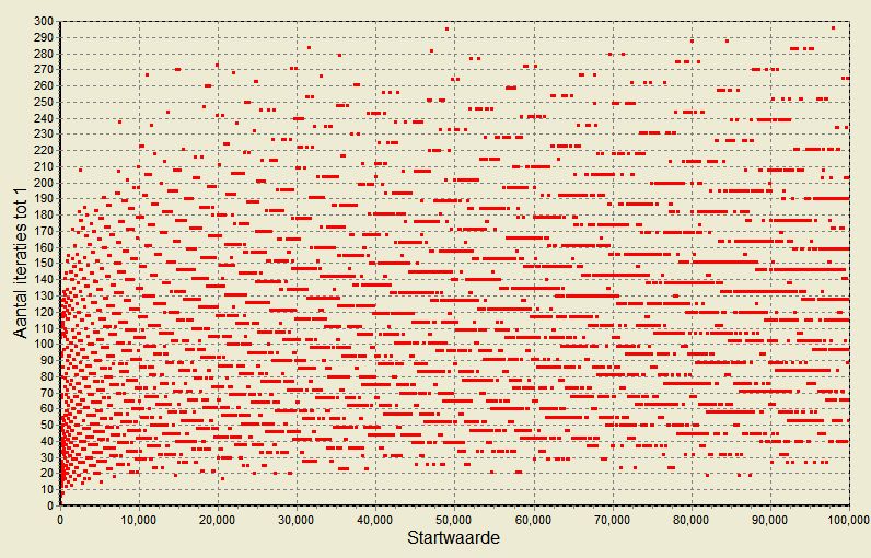 Het verband startwaarde <-> aantal iteraties om tot 1 te komen. 20 000 runs met random getallen 1..100 000 |