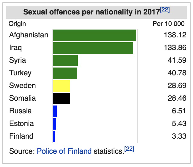 Verkrachtingen volgens nationaliteit, hoe meer Islam en inteelt, hoe meer verkrachters. 1 op 100 moslims is een veroordeelde verkrachter, dan nog deze die ze nog niet te pakken hebben. https://en.wikipedia.org/wiki/Sexual...nce_in_Finland . |