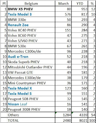 Aandeel % stekkerwagens verdubbelde van 3,2% naar 6,3%. Tesla verkocht in "coronamaand maart" zelfs 3 modellen in de top 4. Met 798 wagens verkocht Tesla in maart 2020 beter dan maart 2019: 676. Ondanks corona en wegvallen Zero Emissie Premie. Citaat: