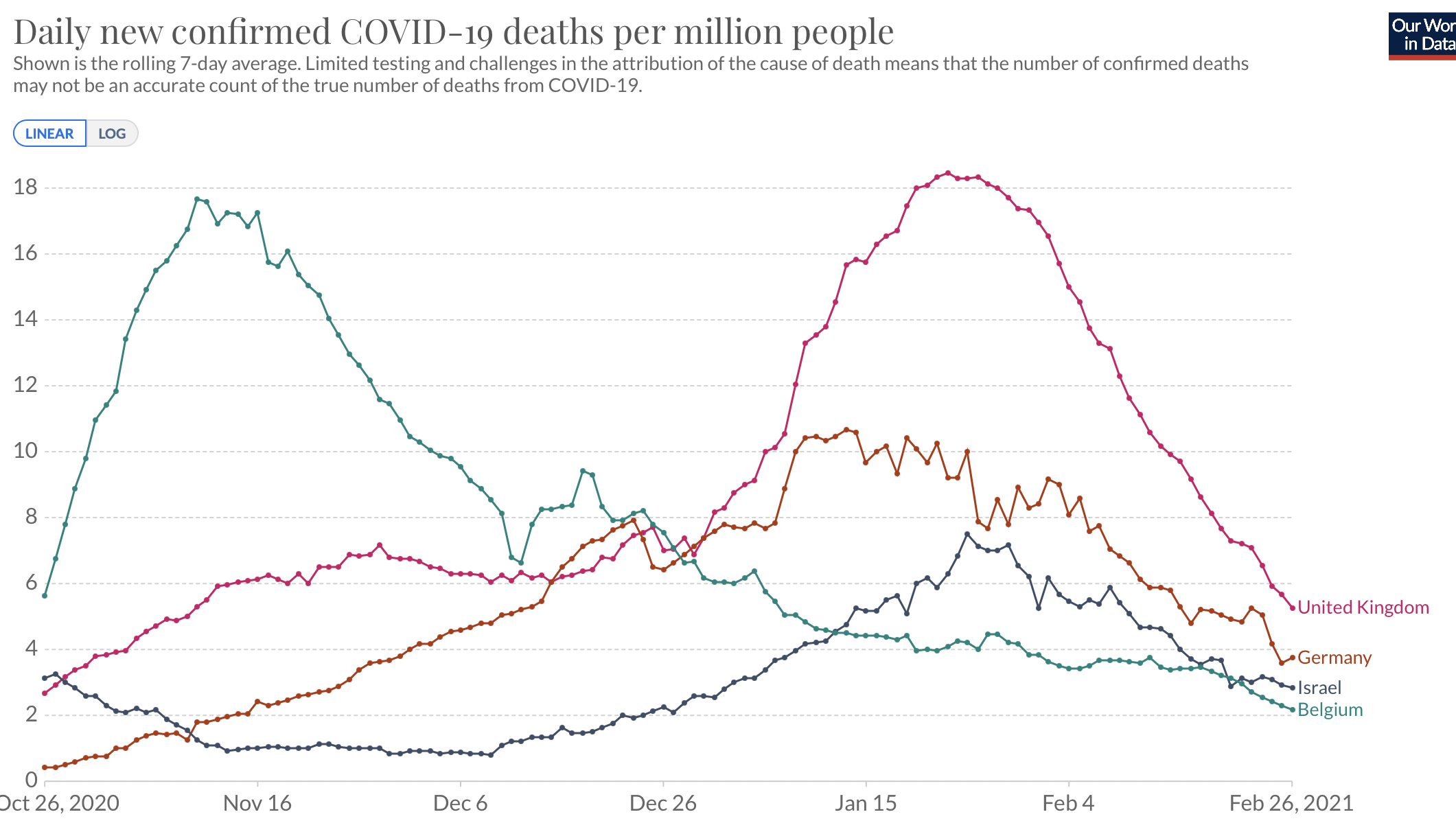 Ik zie geen effect van de vaccins op het aantal besmettingen in Israël of UK. Als je de daling vergelijkt met die van Belgie dan vindt ik de daling trager als bij ons zonder vaccin.