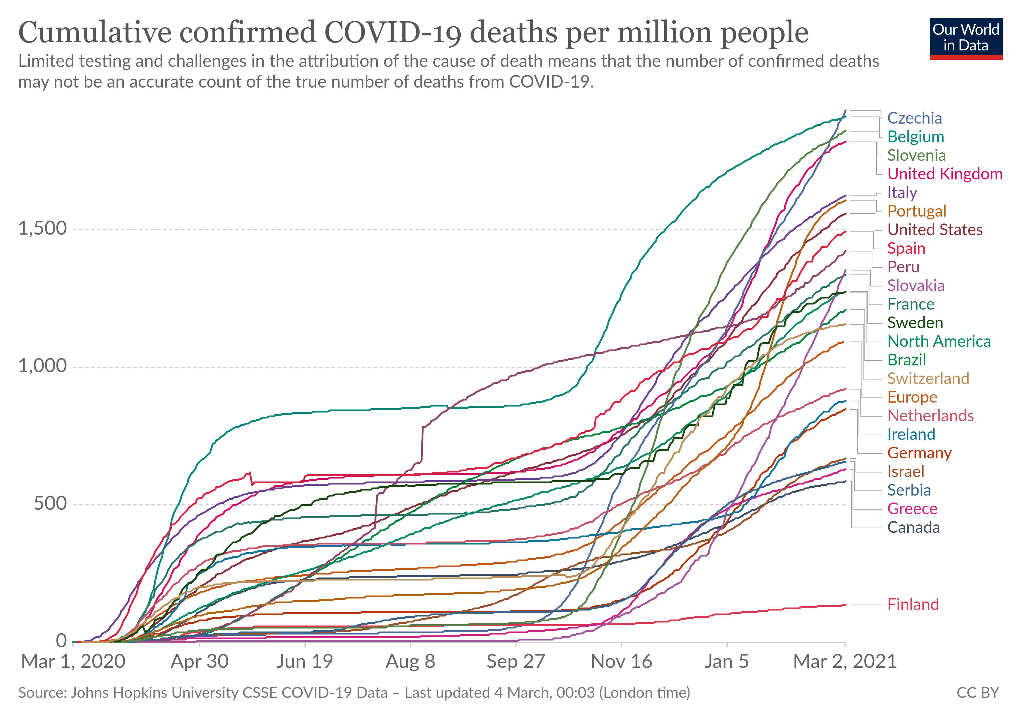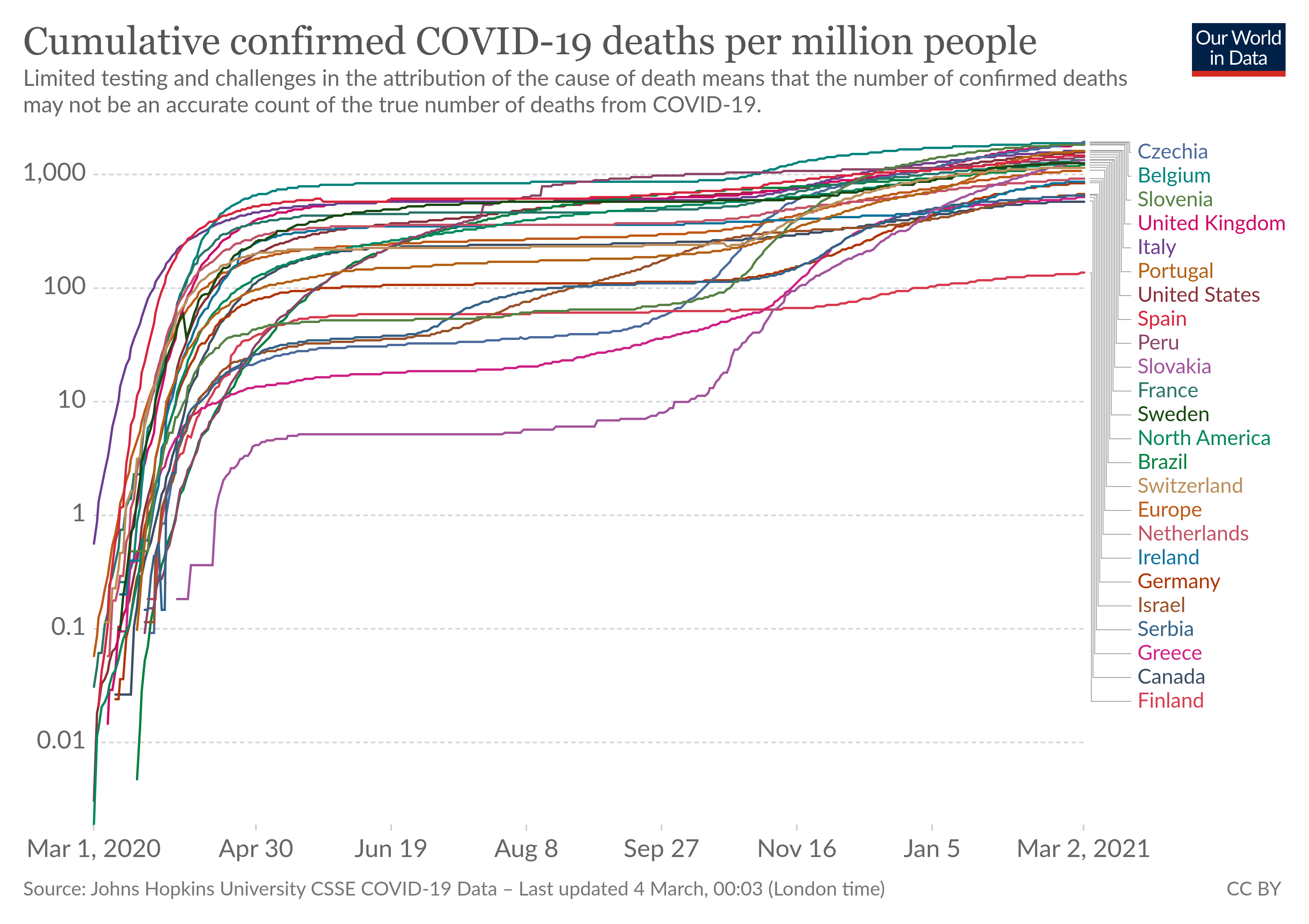 Het enige wat iets lijkt te doen was van het op tijd tegen te houden, niet met interne idiotieen, maar met het sluiten van grenzen en veel testen VOOR het binnen zat, maar slechts enkele landen zijn daarin geslaagd. Ik heb van wat Westerse landen het cumulatieve dodenaantal per miljoen inwoners geplot, en dan nadien nog eens op log schaal. De log schaal is interessant omdat je ziet dat de VERHOUDINGSGEWIJZE dispersie die er nog was (de breedte van de band) na de eerste golf grotendeels is weggewerkt na de tweede golf: we zitten, op Finland na, allemaal in een veel nauwere band, we hebben allemaal ongeveer dezelfde overlijdens, op een factor 3 of zo na. Maw, zij die het "beter" deden tijdens de eerste golf, haalden hun "achterstand" in en omgekeerd. Laatst gewijzigd door patrickve : 4 maart 2021 om 06:10. |