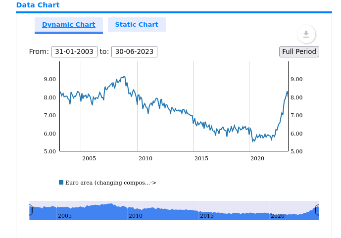 https://sdw.ecb.europa.eu/quickview....C.A.2250.EUR.N Title Bank interest rates - loans to households for consumption APRC (new business) - euro area https://forum.politics.be/attachment...1&d=1691220558 De snelle (hoek met X-as 70*) stijging begon in maart 2022, periode nu 19 maanden. De tragere naar 2008 was 45° en begon januari 2007. de piek was november 2008, periode 22 maanden. 3 maanden te gaan bij gelijke periode. Hetzelfde is hier te zien: https://www.euro-area-statistics.org...a.html?lang=en Zo zie je, de centrale plannerkes spreken hun prijzen netjes... oeps... harmoniseren zich netjes samen tot hun symfonie van de zwanezang van bestaand geld. Der zal weer zoveel miljard verdampen op de beurs. Als je het in de gazetten leest weet je dat je te laat bent.