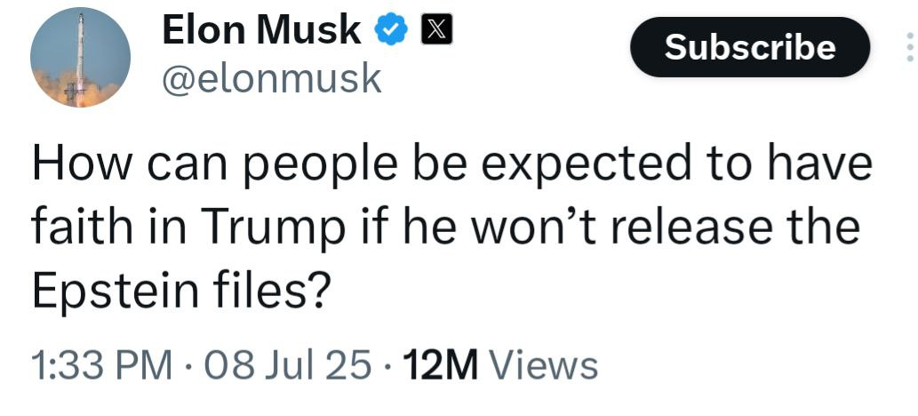 De drie reeds eerder vermelde communisten, het triumviraat begint onderling ruzie te maken. Musk verwijt de andere twee dat ze in de Epstein bestanden zitten, die maar niet vrijgegeven geraken, hoewel dat beloofd was. De eerste prioriteit van de nieuwe partij opgericht door Musk wordt het vrijgeven van deze bestanden, meldt Musk. Hoofdzaak of een Amuse-Gueule voor het plebs?