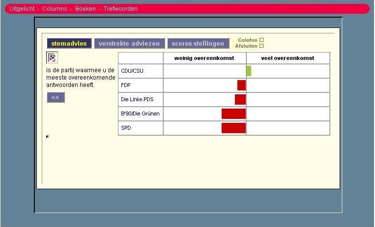 Ik had CDU , SPD en groenen op zelfde hoogte. Hoe dat mogelijk is weet ik ook niet. In belgie zijn die testen toch veel verfijnder en evenwichtiger. maar het zegt ook iets over de vaagheid van die partijen in duitsland. |