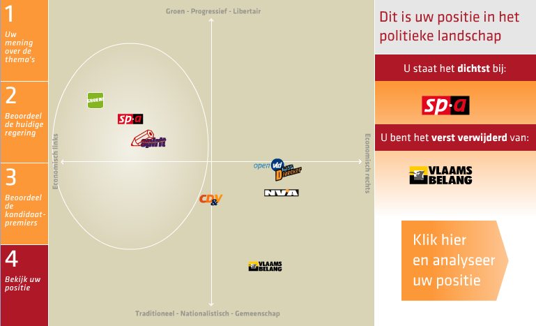 Hij is wel een beetje misleidend. Het advies is SP-A (74%), spirit lijkt met 73% dichterbij te staan en groen met 72% best ver weg, waar CD&V met ook 72% (schaam, schaam) nog verder staat. en het advies zal ook wel slechter worden door het niet hebben van een mening over de huidige regeringen en de kopstukken.