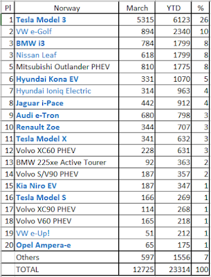 Maart 2019 is de eerste volledige maand dat het model 3 verkocht werd, want pas de 6 februari kwam de eerste boot in Zeebrugge aan. Het model 3 wordt voorlopig maar in *14 Europese landen verkocht. Er geraakten nog veel wagens niet rechttijdig bij de klanten door de povere logistiek (delivery hell). Wereldwijd (vooral door overzeese Europa en China) bleven zo 10.600 Teslas in transit, tov maar 2.907 Q4-2018. Zoals te verwachten laat het model 3 de anderen ver achter, ook in het volledig eerste kwartaal. Het model 3 alleen zorgt voor 16% van alle verkochte stekkerwagens in Europa dus inclusief plug-in hybrides (PHEV of "de compliance-modellen"). Alle Teslas zorgen voor ~18%. Model S nog nipt 20e (en model X is 22e staat niet op de tabel) Ook dankzij het model 3 is het aandeel BEV naar 69% gestegen. Qua alle wagens halen de BEVs nu een marktaandeel van 2,4% in maart 2019 een stijging van 69% tov maart 2018. Citaat: