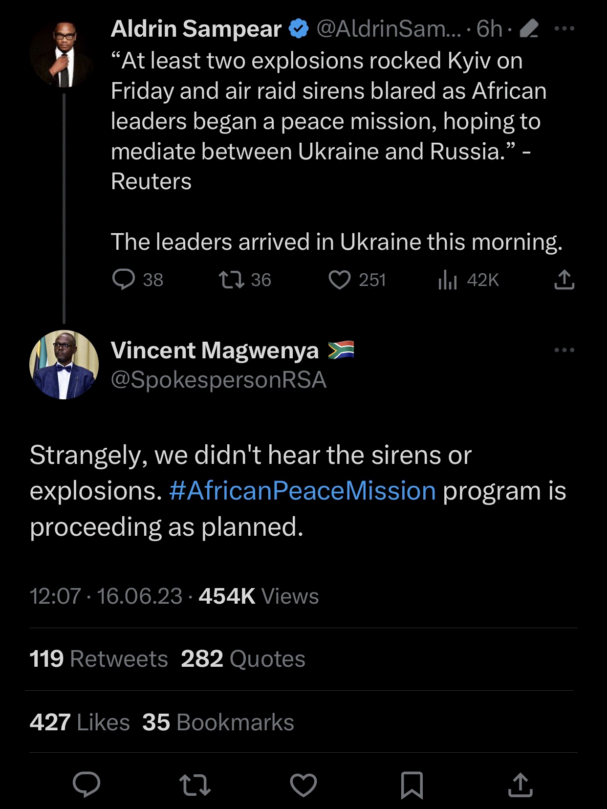 “We witnessed a missile attack”: South African President Cyril Ramaphosa confirmed the missile attack on Kiev He stated this at a briefing, despite the words of his own speaker, who suggested that the rocket attack on Kyiv was disinformation by Ukraine. Oftewel: roebeltje roebeltje aan de wand, wie krijgt er de meeste steekpenningen in het land? Laatst gewijzigd door Tommeke : 17 juni 2023 om 15:11. |