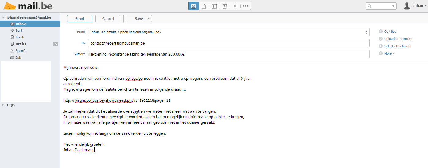 Ik moet me burgerlijke partij stellen in een fraudezaak die wordt onderzocht in Mechelen op aanwijzingen van de BBI van Hasselt .... en ..... waarvan de federale overheid financiën in Namen vandaag nog steeds beweerd dat ik er het brein achter ben. Hoe veel zotter kan het worden? Laatst gewijzigd door Johan Daelemans : 16 juni 2015 om 12:15. |