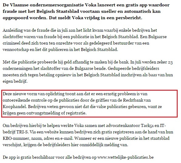 Is dat de reden waarom publicaties in het staatsblad waardeloos zijn voor de fiscus? (de publicaties die mij vrijpleiten zijn in de vuilbak gekieperd) Wel even corrigeren... de publicaties worden wel als waar aangenomen als het in het voordeel van de fiscus uitdraait. Nog even aanstippen dat we al in 2015 zijn aanbeland... Inktpotten en aangescherpte veren zijn buiten ons overheidsapparaat al een tijdje in onbruik geraakt. Wantoestanden en corruptie bij onze overheden - hoe lang nog? Toch wel absurd dat VOKA moet inspringen om de boel recht te trekken. |
