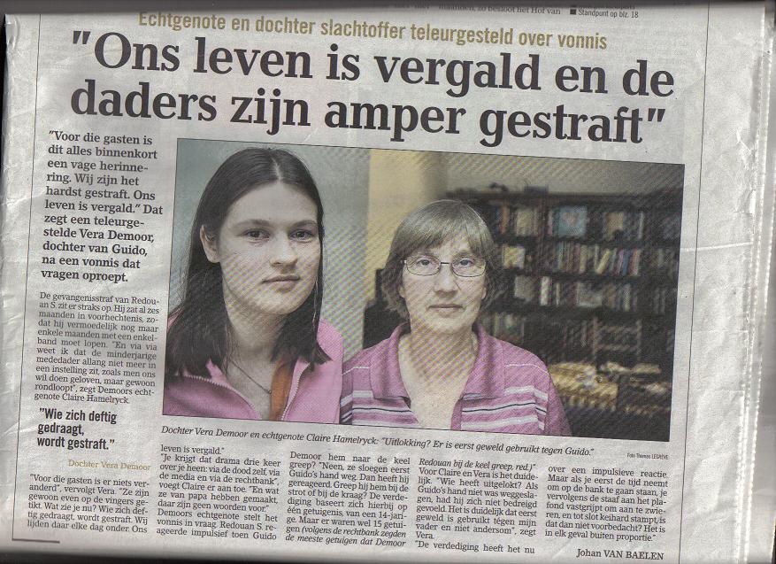 Stel dat Demoor niet dood was gegaan, een kwestie van centimeters en Pascals. Stel dat er een flic op die tram zat. Stel dat de dader en Demoor zouden moeten voorkomen. Wie had er dan de zwaarste straf verdiend? De uitlokker? Degene die begon met geweld te plegen? Juist. |