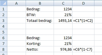 In D3/D8 staan de formules uit C3/C8. In de praktijk zal men het resultaat vaak nog afronden met de "round" functie. Als het percentage niet als 21%, maar gewoon als 21 is ingevoerd, moeten in de formules C2 en C7 door 100 gedeeld worden. Citaat: