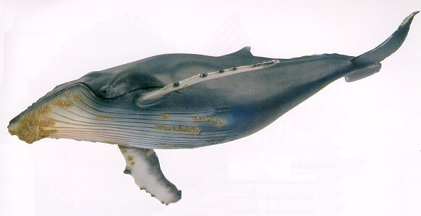 Mijn reus weegt "maar" 20 tot 30 ton. Als hij onderduikt wordt de rug sterk gekromd en komt de kleine rugvin als een soort bult boven water. (=tip)