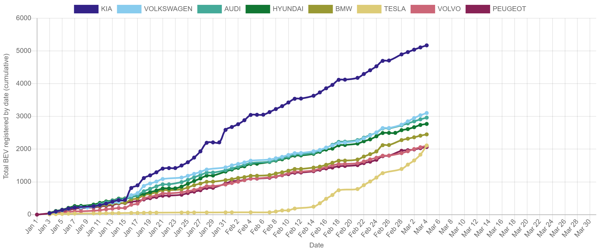 Spanje, Noorwegen, Nederland en Zweden worden dagelijks bijgewerkt, de charts hieronder. Bovenste chart maart, eronder februari, onderaan januari. In januari-februari stak KIA er nog ver bovenuit, Tesla begint pas langzaam vanaf half februari (januari onbestaande) https://eu-evs.com/bestSellersCharts...by-Days/2022/3 Best sellers for Mar 2022 (showing top 8), cumulative registrations by days. Countries: ES, NL, NO, SE Laatst gewijzigd door Micele : 3 maart 2022 om 16:30. |