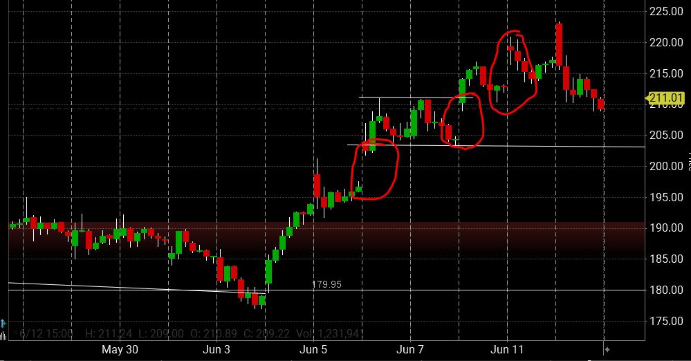 ![]() Er zijn drie gaps. De eerste is al gevuld. De twee andere nog niet. Ik verwacht dat de tweede gap ook gevuld zal worden. Dan is het uitkijken naar het niveau $204. Als het daar doorzakt, dan wordt ook de derde gap gevuld tot $195. Als het richting $195 gaat koop ik enkele short term calls om mijn shortpositie te hedgen omdat ik verwacht dat de koers van dat niveau terug zal stijgen in afwachting van de juni leveringen (75k - 85k) en de Q2 resultaten. Voor het bekendmaken van de 10-Q sluit ik deze om vervolgens extra te shorten. Het aandeel gaat bij 85k deliveries trenden om daarna terug te vallen eens de realiteit van de 10-Q doordringt.